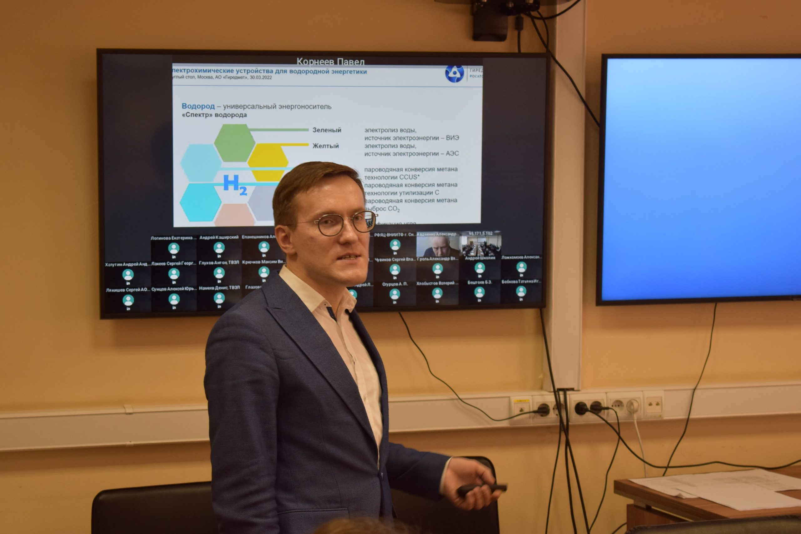 Председатель круглого стола Максим Ананьев отметил важность кооперации научных знаний, производственных мощностей и государственной поддержки. По его мнению, это в значительной степени поможет решить вопросы импортонезависимости, энергетической безопасности и создания конкурентоспособных устройств для получения и использования водорода. Также он рассказал о планируемых проектах института в этой сфере и эффективности использования твердооксидных электрохимических устройств для водородной энергетики, разработанных в АО «Гиредмет».