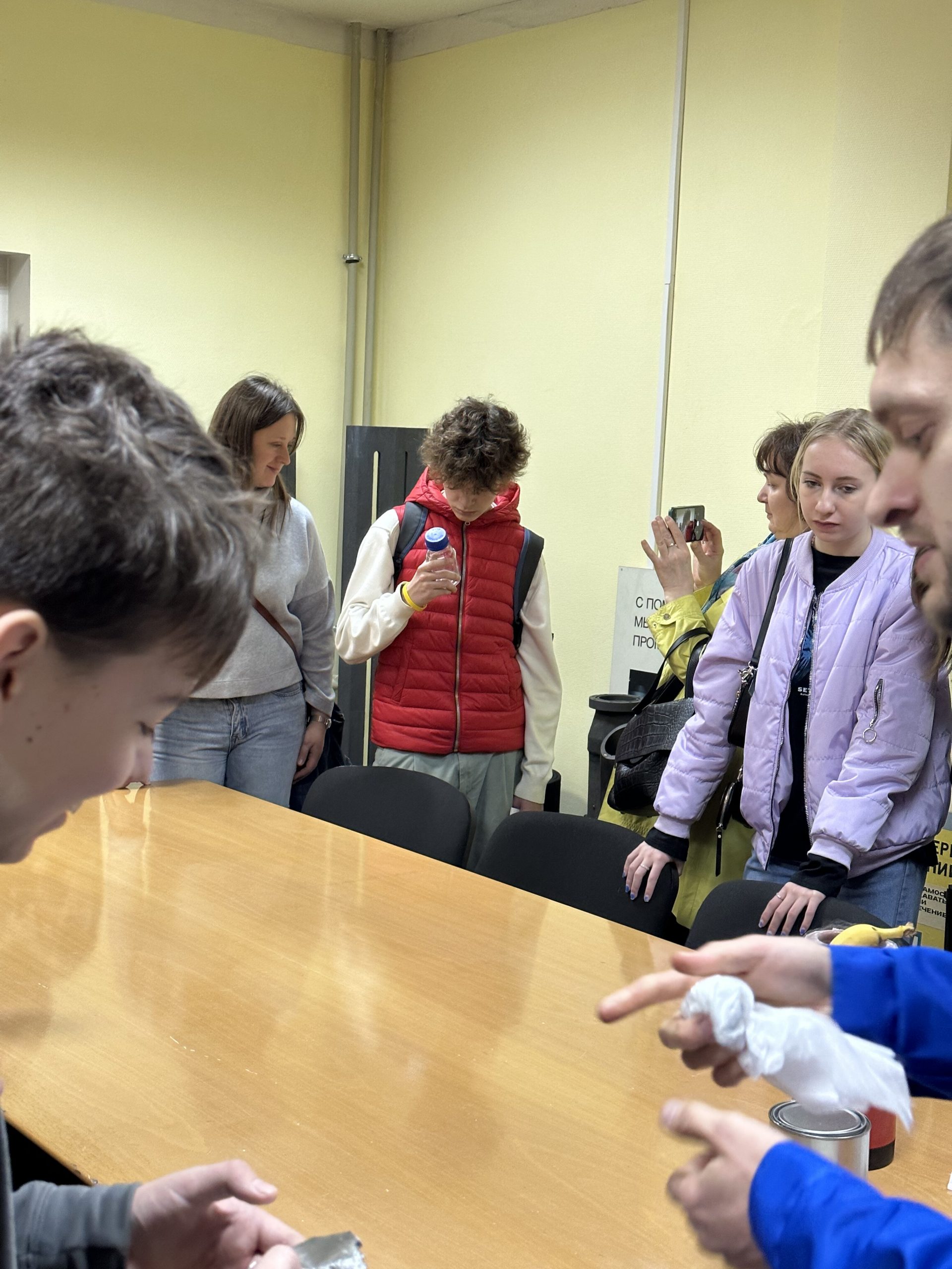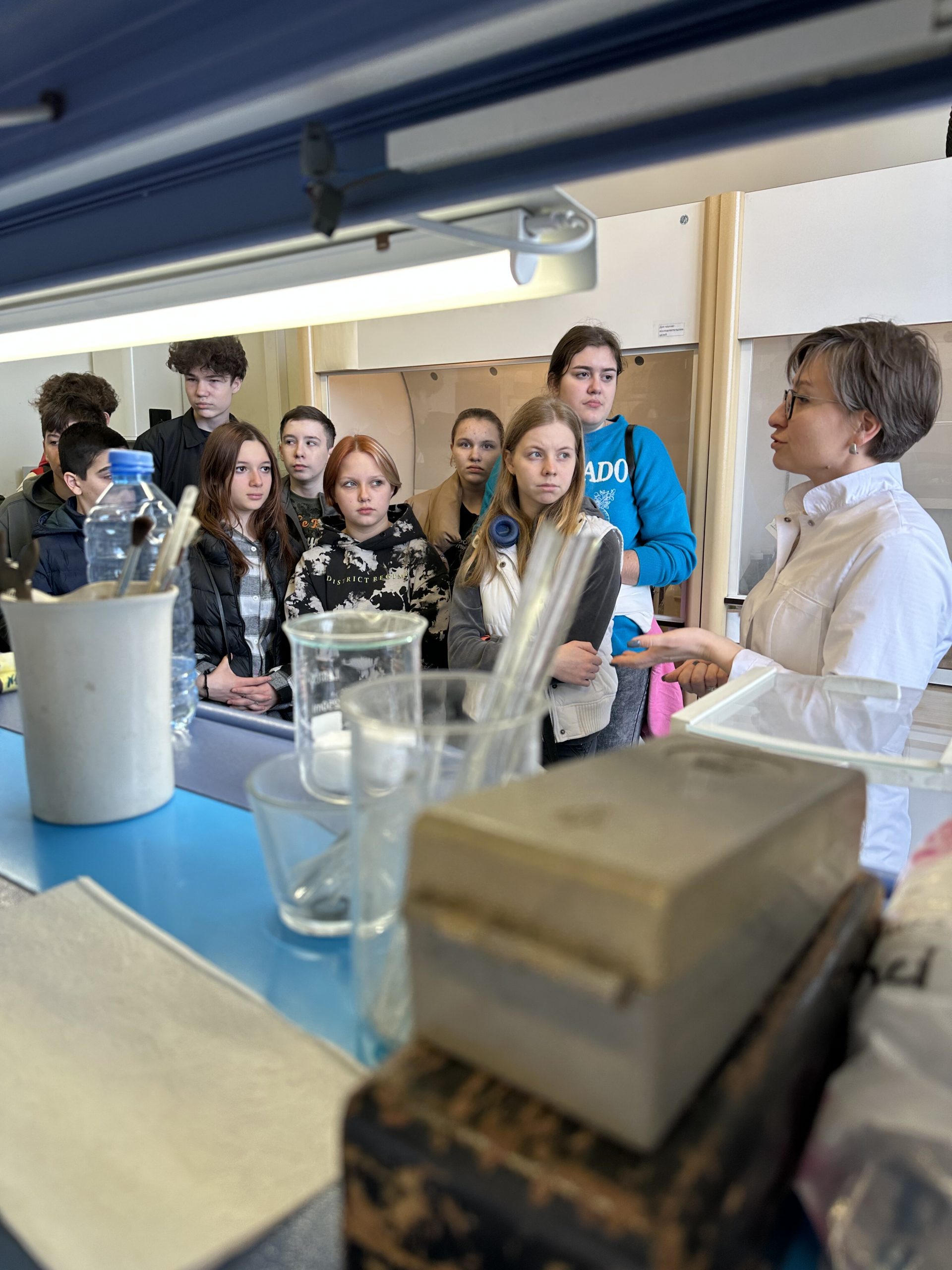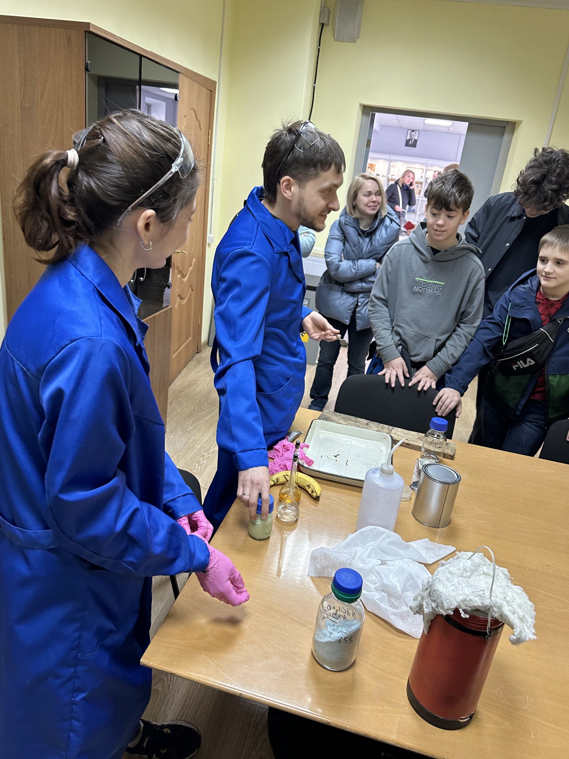 Начальник лаборатории Сергей Василенко провел мастер-класс с элементами химических экспериментов: реакцию и взаимодействие веществ с азотом, скандием и натрием, реакцию растворов роданида аммония, хлорида железа и хлорид неодима, который менял окраску при изменении освещения.